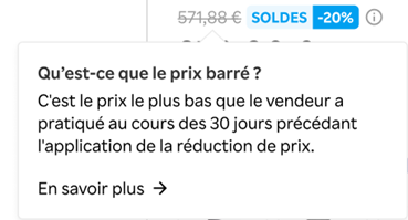 Gemäß Artikel L.112-1-1 des französischen Verbraucherschutzgesetzes entspricht der durchgestrichene Preis im Falle von Ausverkaufsartikeln dem vom Verkäufer zuvor praktizierten Preis während eines Zeitraums von mindestens 30 Tagen vor Anwendung der Preisreduzierung.
