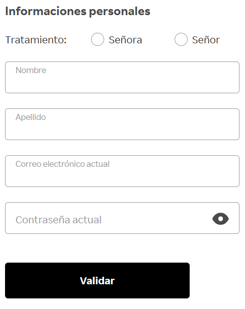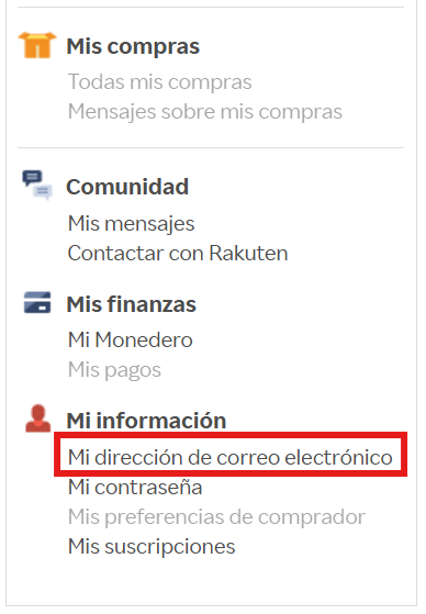 Puedes verificar en cualquier momento si ingresaste correctamente tu dirección de correo electrónico en la pestaña "Mis datos personales" de tu cuenta Rakuten, y luego ir a la sección "Mi dirección de correo electrónico".