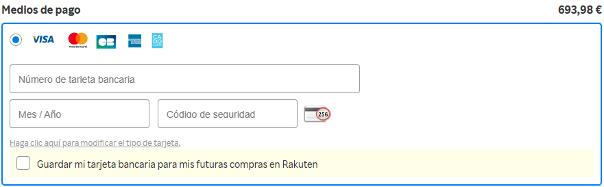Una vez guardada, su tarjeta se propondrá automáticamente como método de pago en futuras compras en Rakuten.