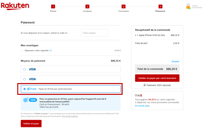 L'option de paiement 10XCB FLOA est disponible pour les achats entre 200 € d'achat et jusqu'à 3 000 €.