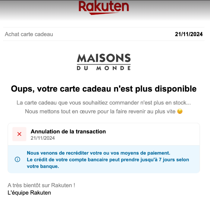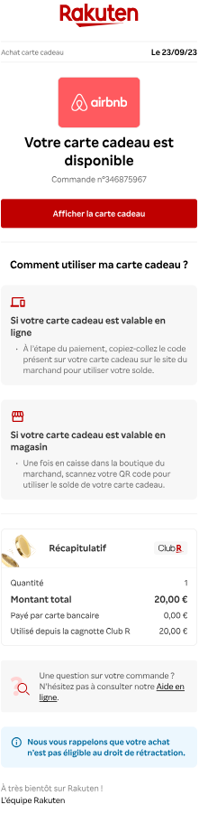 - Réception de la Carte Cadeau et/ou bon d'achat 📩: Vous pourrez récupérer votre carte cadeau ou bon d'achat, directement par mail et dans votre Compte Rakuten, dans la rubrique "Mes Cartes Cadeaux".
